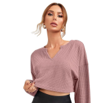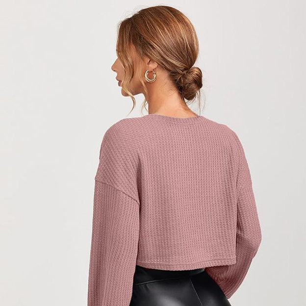 Waffle (Cotton) Long Sleeve 2025 Fall Fashion V Neck Basics Crop Tops Slim Fitted T Shirts